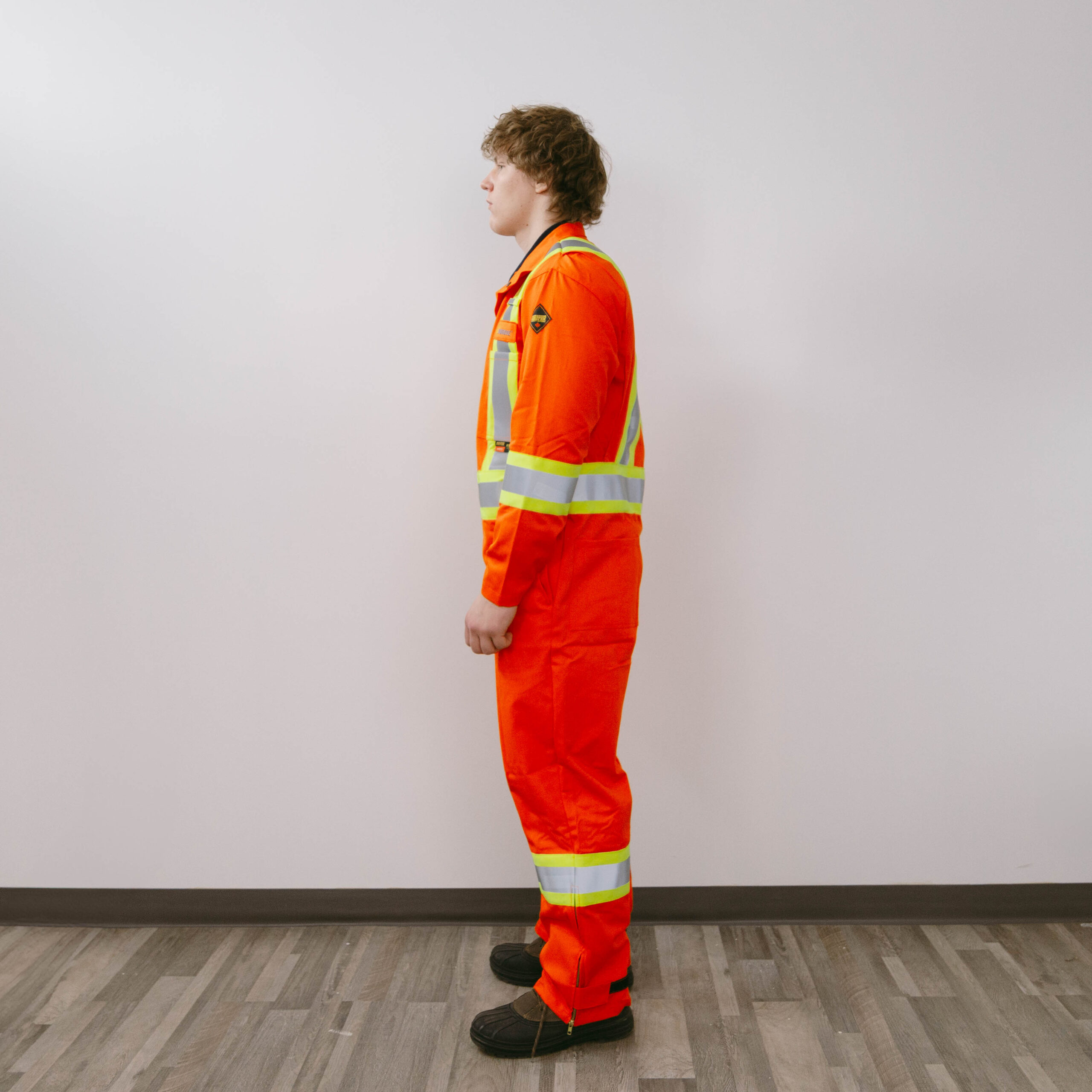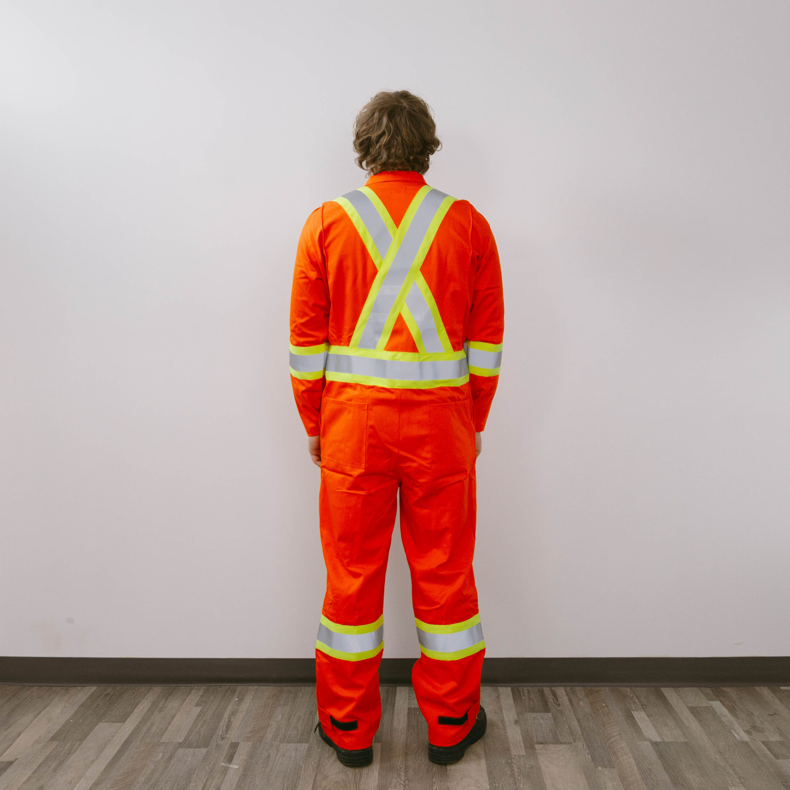 REFLECTIVE: INDUSTRIAL WASH RATED SILVER REFLECTIVE MATERIAL 2 INCHES STITCHED ON 4” ENHANCED VISIBILITY TRIM: 2 VERTICAL ON FRONT (FROM SHOULDER TO WAIST), “X” ON THE BACK THAT MEET AT SHOULDER, ALL AROUND WAIST AND 1 HORIZONTAL STRIPE ON EACH ARM AND LEG.