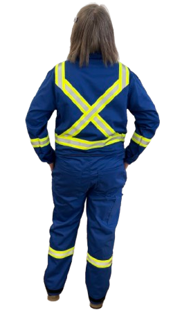 REFLECTIVE: INDUSTRIAL WASH RATED FR SILVER REFLECTIVE MATERIAL ¾ INCHES ON 2” ENHANCED VISIBILITY TRIM: 2 VERTICAL ON FRONT (FROM SHOULDER TO WAIST), “X” ON THE BACK THAT MEET AT SHOULDER, ALL AROUND WAIST AND 1 HORIZONTAL STRIPE ON EACH ARM AND LEG.